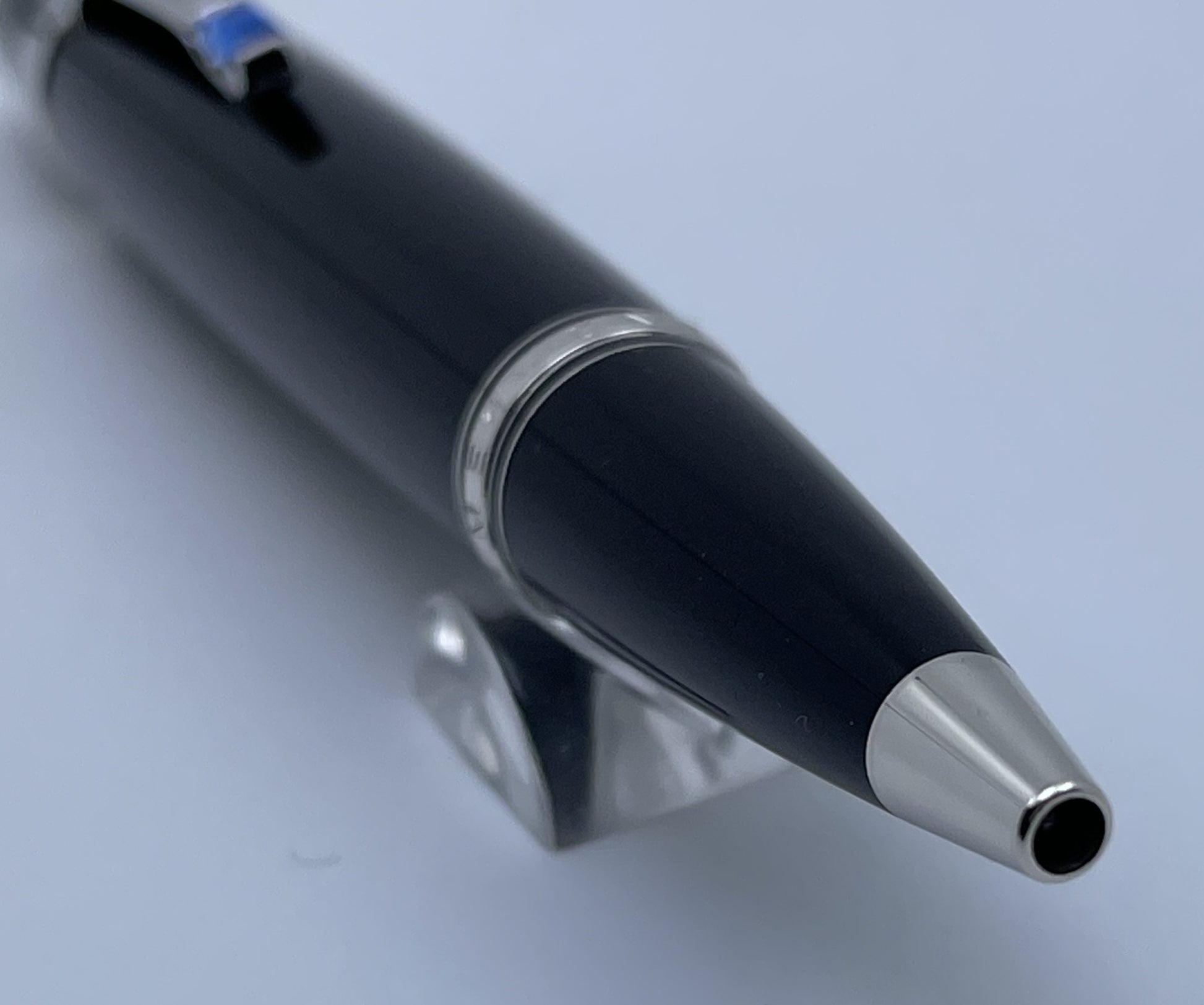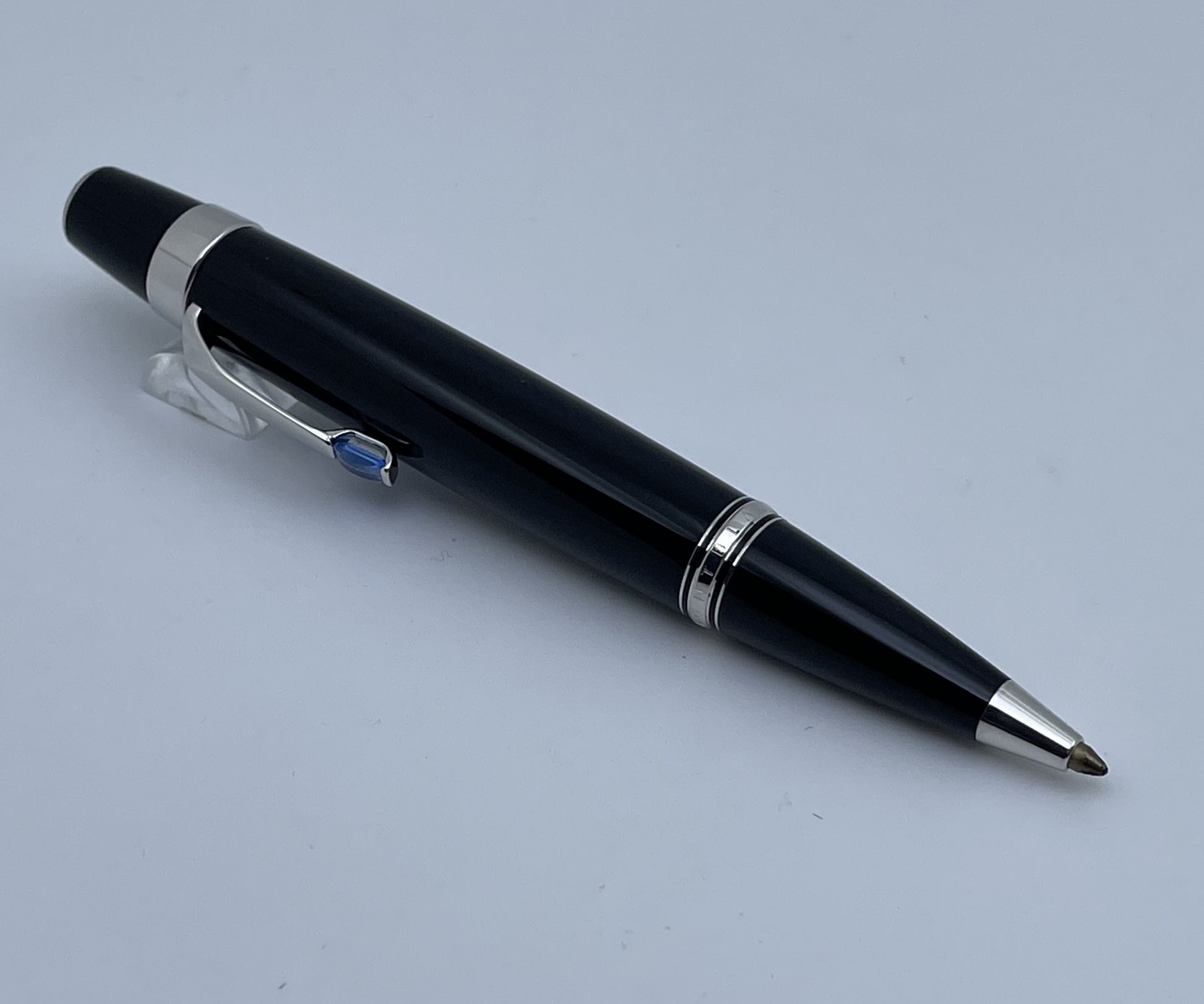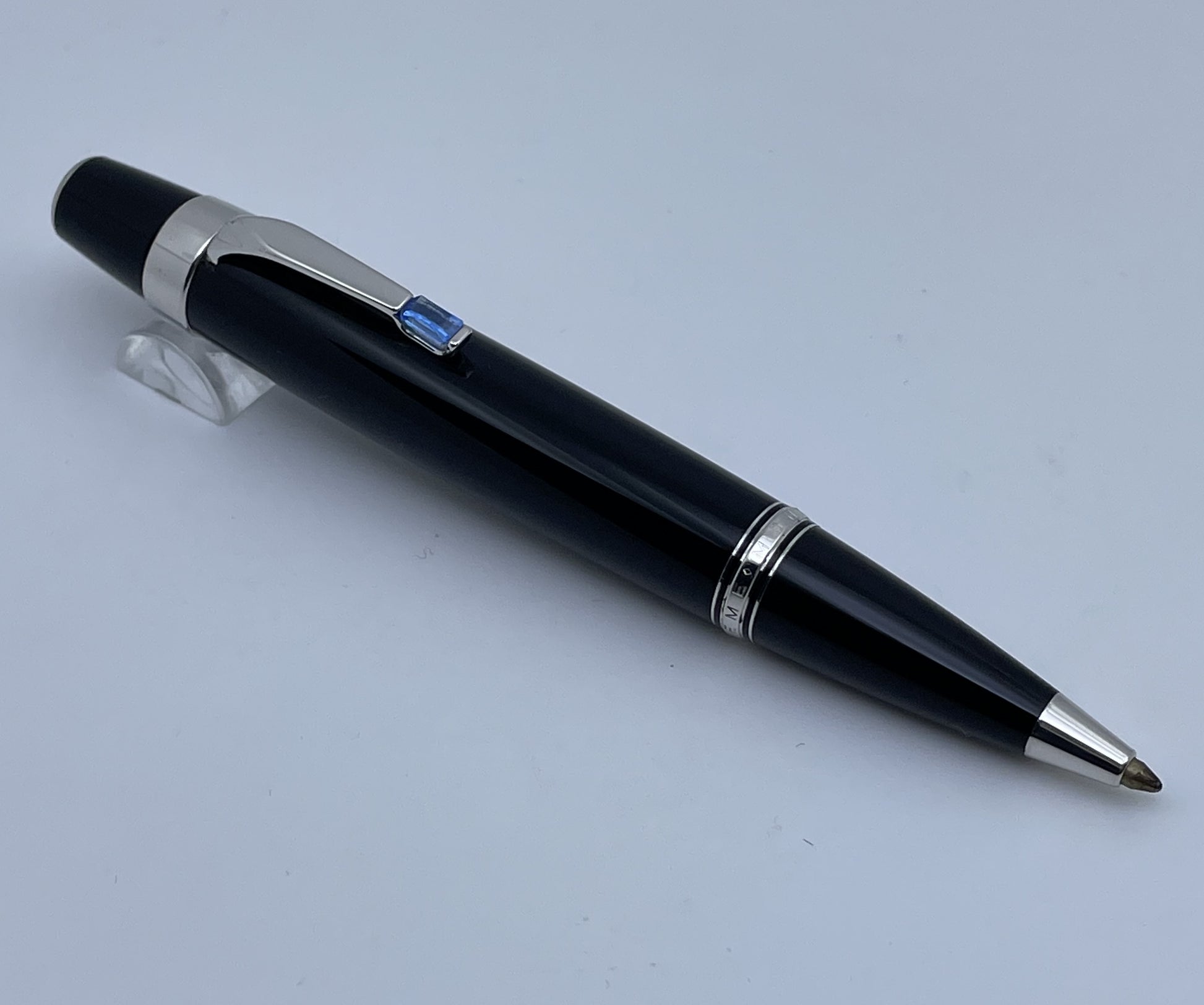 Material - Black precious resin barrel and cap, with platinum trim and clip set with a blue sapphire.